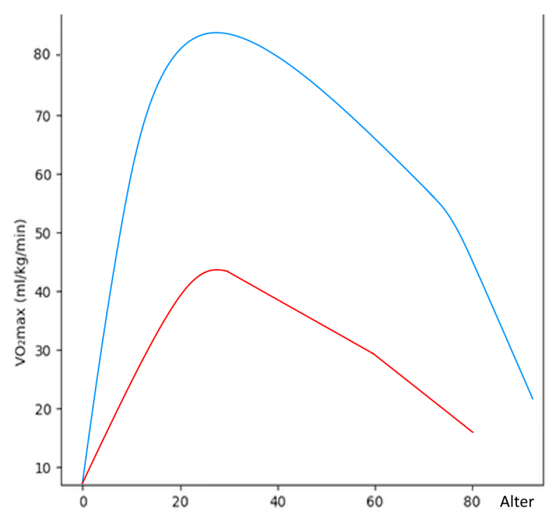 Further data: VO2max usually peaks at around 25 years of age. After that, it declines by approx. 0.5 – 1 ml/kg/min without training, and somewhat more steeply from around 75 years of age. The blue curve in the following model graph shows an elite athlete, where the maximum is over 85 (cyclist) or over 90 (runner). Well-trained amateur athletes with good genetic disposition achieve values of up to 70. The red curve shows a typical progression for sedentary life, no exercise to moderate exercise. The decline in both curves is due to falling HRmax, decreasing stroke volume SVmax, sarcopenia and decreasing diffusion capacity a-vO2-Diff. The data suggests that a former elite long-distance runner aged 70 still has approximately the same VO2max as a completely untrained person of the same age and, at his peak, had almost twice the VO2max of an untrained person of the same age. VO2max is approximately 10-15% lower in women than in men. With an adequate training programme, predominantly sedentary non-athletes can increase their VO2max by 15-20% within 6 months.