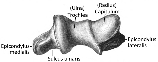 The distal end of the humerus has two articular surfaces: laterally the capitulum humeri(radius) and medially the trochlea humeri(ulna).