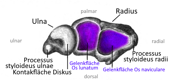 Cartilaginous articular body made of tight connective tissue with parallel fibers between the distal ulna and the concave articular surface of the lunate bone (Os lunatum ) and partly also of the triangular bone (Os triquetrum). The discus is part of the TFCC and lies between the dorsal radioulnar ligament and the palmar radioulnar ligament. The meniscus ulnocarpalis lies between the discus and the triquetrum.
